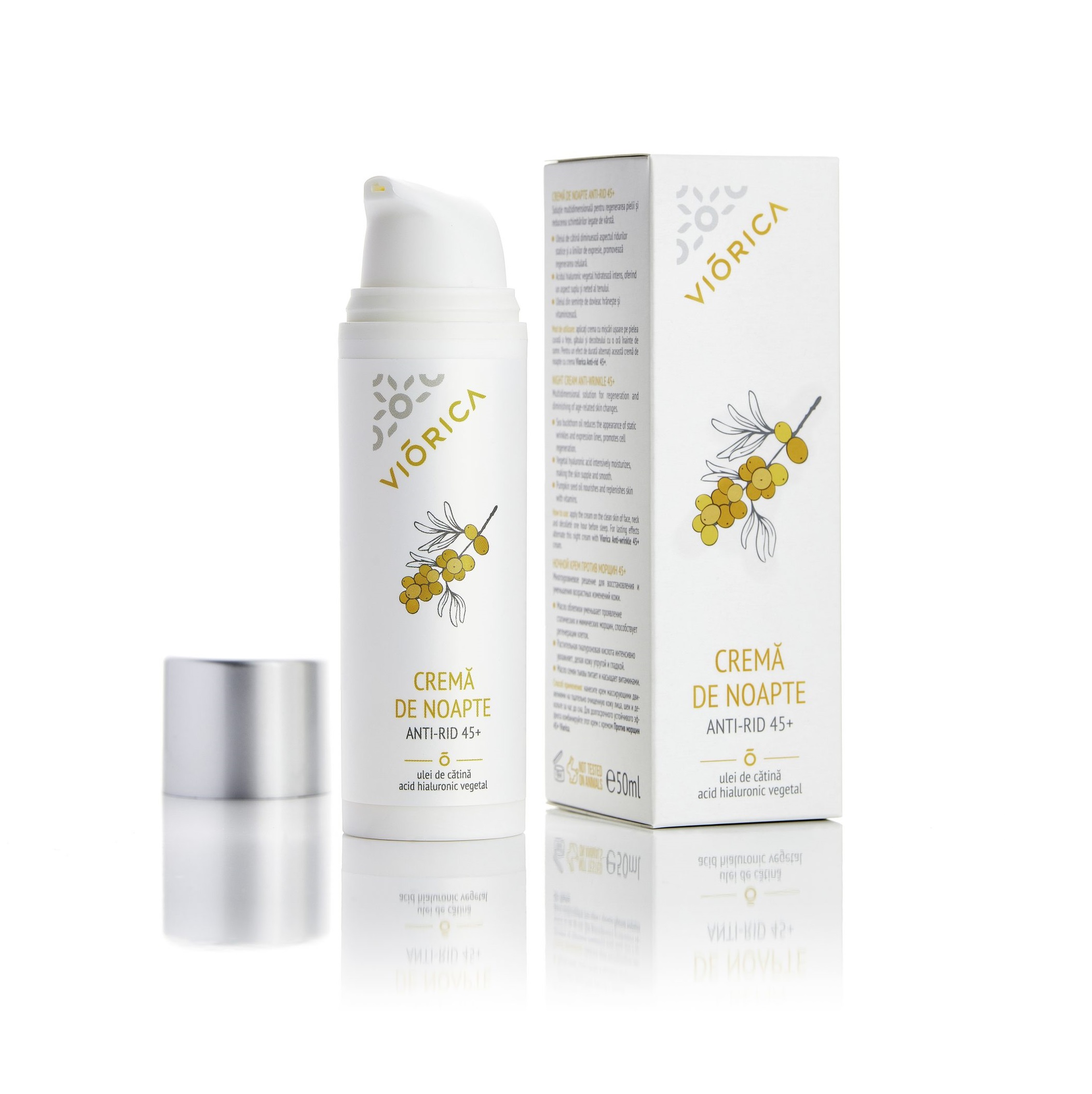 Naudojimas: lengvais masažuojamaisiais judesiais tepkite kremą ant švarios veido, kaklo ir dekoltė odos. Norint pasiekti ilgalaikį ir tvarų poveikį, naudokite kiekvieną vakarą 1 valandą prieš miegą ir derinkite su Viorica kremu nuo raukšlių 45+. Nebandyta su gyvūnais.