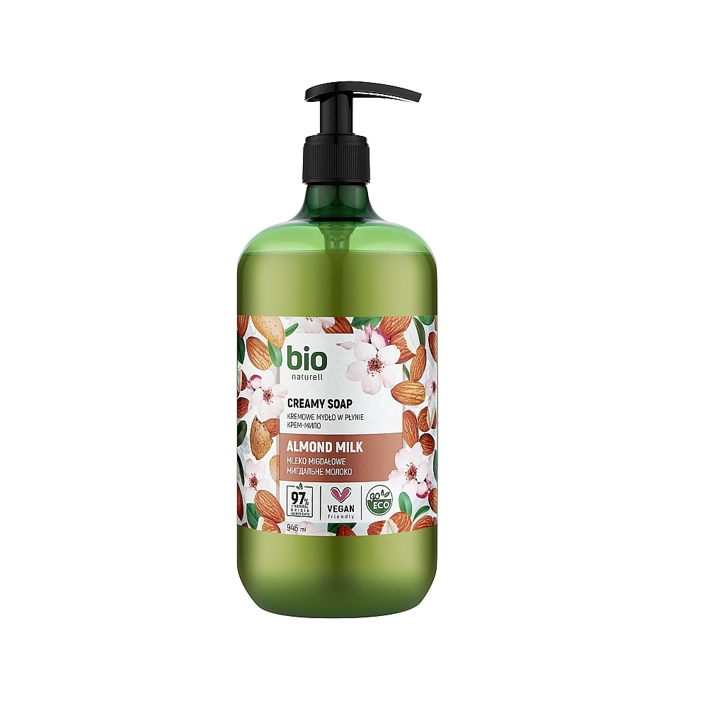 TМ Bio Naturell krēmziepes satur komponentus, kas efektīvi un maigi attīra ādu. Mandeļu eļļa un glicerīns mīkstina ādu, padara to elastīgāku un koptu, novēršot mitruma zudumu. Vegānisks produkts.